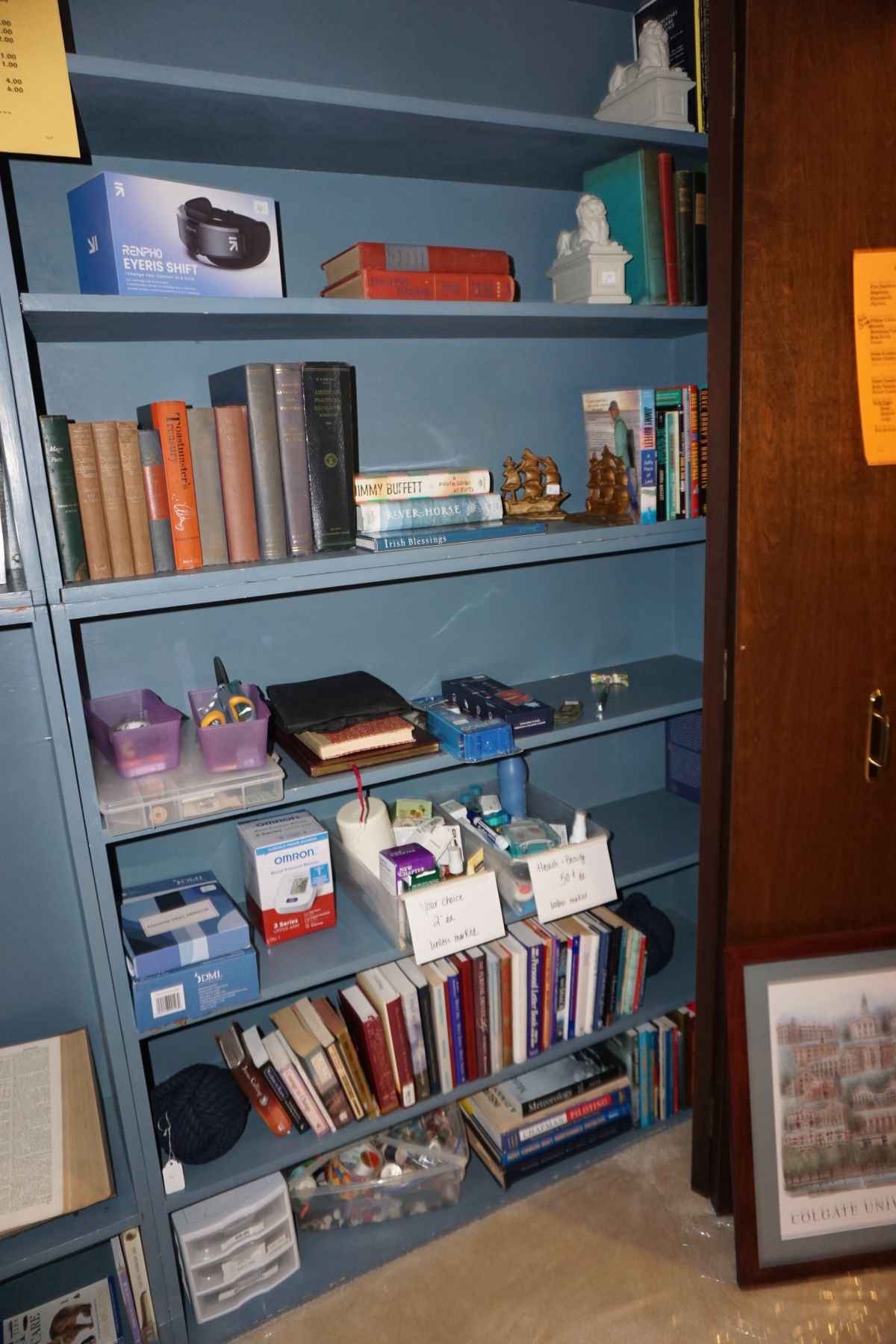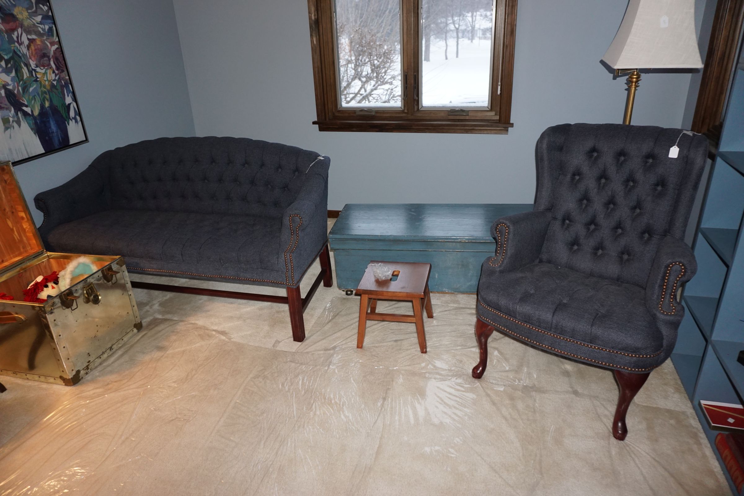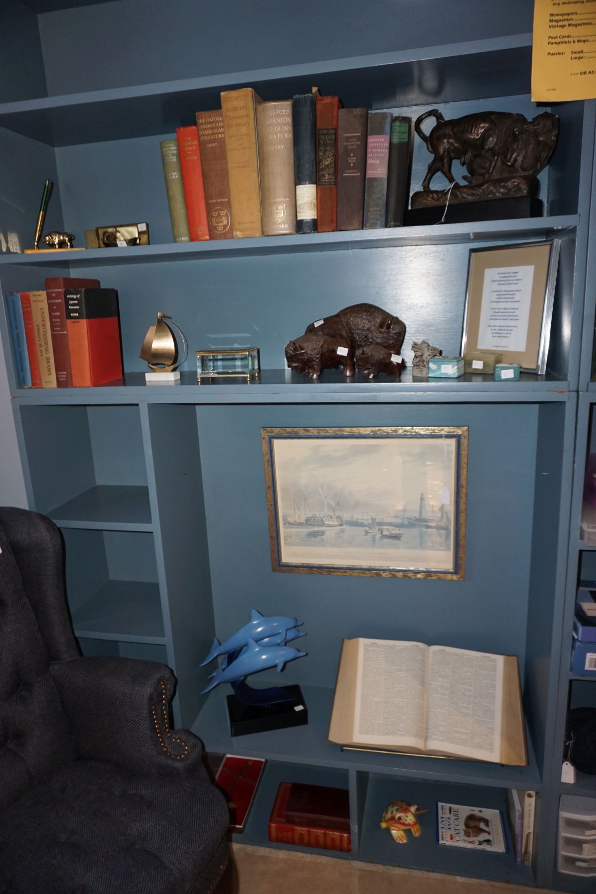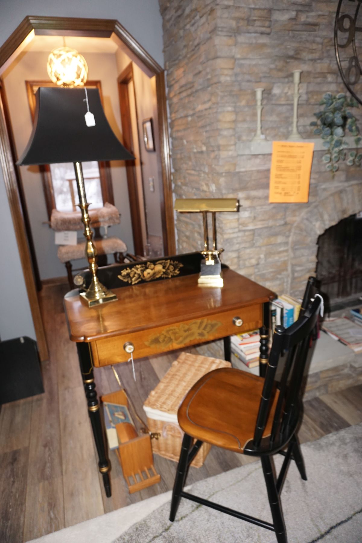 Hitchcock Writing Desk with chair & Demilune table, set of black & gold stenciled nesting tables, Contemporary electric reclining love seat, many occasional tables, chairs & lamps, kitchenware, books, slanted wall bookcase, wine rack, curio cabinet, desk, mirrors, painted mid-century modern dinette set, loads of artwork including originals, signed lithographs & more, Link Taylor solid cherry dressers & night stand, gold powder coated metal queen size bed with quality mattress set, jewelry chest, full bed, wicker chairs & cheval mirror, dressing table, ladies quality clothing including many Lands End & Talbots, tufted camel back settee & matching wing back chair, cedar chests, linens, WWII Seth Thomas U. S. Navy clock, many nautical home décor items, patio furniture, NordicTrack Elliptical, cherry corned etagere woth brass rail, Ethan Allen small 1 drawer stend with brass rail, Contemporary sofa table, contemporary desk & chair, Red Light Therapy light, stone façade electric fireplace, wrought iron shelf unit, Go2Gether snow shoes/walking sticks, cross country skis, area rugs, holiday décor, newer GE freezer, cat accessories, trunk, fiberglass 24 foot & 8 foot ladders, tools, yard & garden, costume jewelry & much misc!