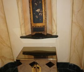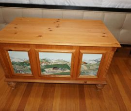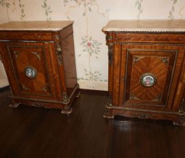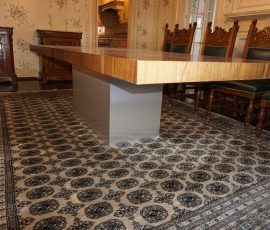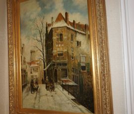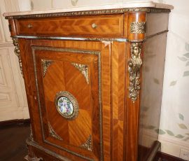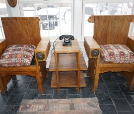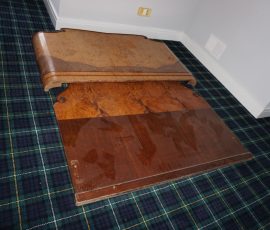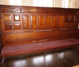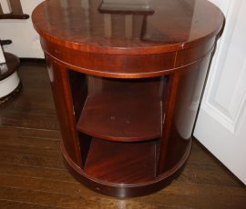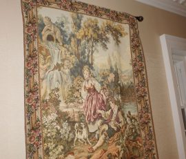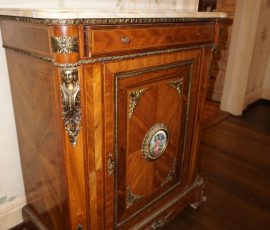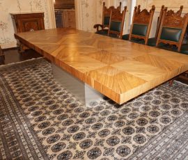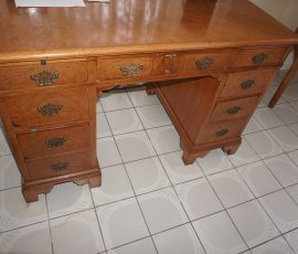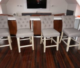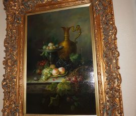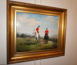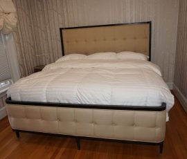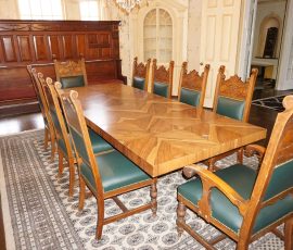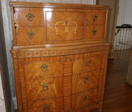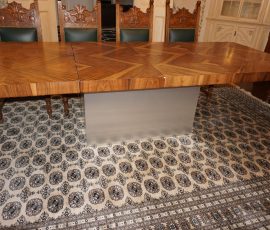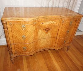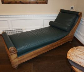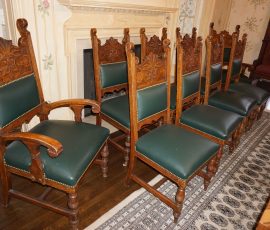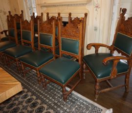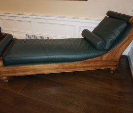 Buffalo Historical High Back Ornately carved Mahogany Settle Bench from The Statler Hilton Hotel, Milo Boughman for Thayer Coggins Walnut Chevron Style with Stainless Steel Base, Set of 9 Antique 19th century carved oak & leather dining room chairs with carved North Wind Face (2 arm chairs & 7 side chairs), pair of Napolean III French Marble Top cabinets with brass ormolu, 10’ x 14’ Bokara Oriental rug, Pine Farmhouse Trestle dining table, set of 8 leather seated chairs, carved Chinese oriental rug, kneehole desk, pair of brass & chrome 2 door cabinets, pair of Asian wall hangings, area rugs, Fox Hunt Oil on Canvas painting by Domingo, Baker Furniture Empire banded mahogany drum table, Louis Phillipe style walnut & leather fainting couch, Mitchel Gold & Bob Williams leather & metal large ottoman, pair of matching tweed style contemporary sofas, Baker Furniture Round pedestal console table, tapestry wall hanging, Large oil on canvas fruit still life in ornate frame, oil on canvas painting of village street scene, Samsung x large TV, Restoration Hardware Mercantile Collection chest/cabinet, pair of reclaimed wood side tables, Baker Furniture bi level coffee table, leather sofa, pair of ornate French provincial lamps, leather recliner, Barbara Barry Collection for Baker Furniture dining table with two leaves & 4 chairs, Set of 4 Butler Everson wood & metal bar stools, Antique French Walnut Armoire, Pair of Vintage Cast Aluminum Barcelona Chairs ( Miles Van Der Rohe), Brutalist chairs & tables, King size tufted upholstered bed, cedar chest, dressers, pair of Queen Size Bassett beds & matching night stands, bar stools, leather sectional, kitchenware, quality patio furniture including two sets of table & chairs, wicker sofa & pair of chairs, metal sofas & table, chaise lounges & more!!