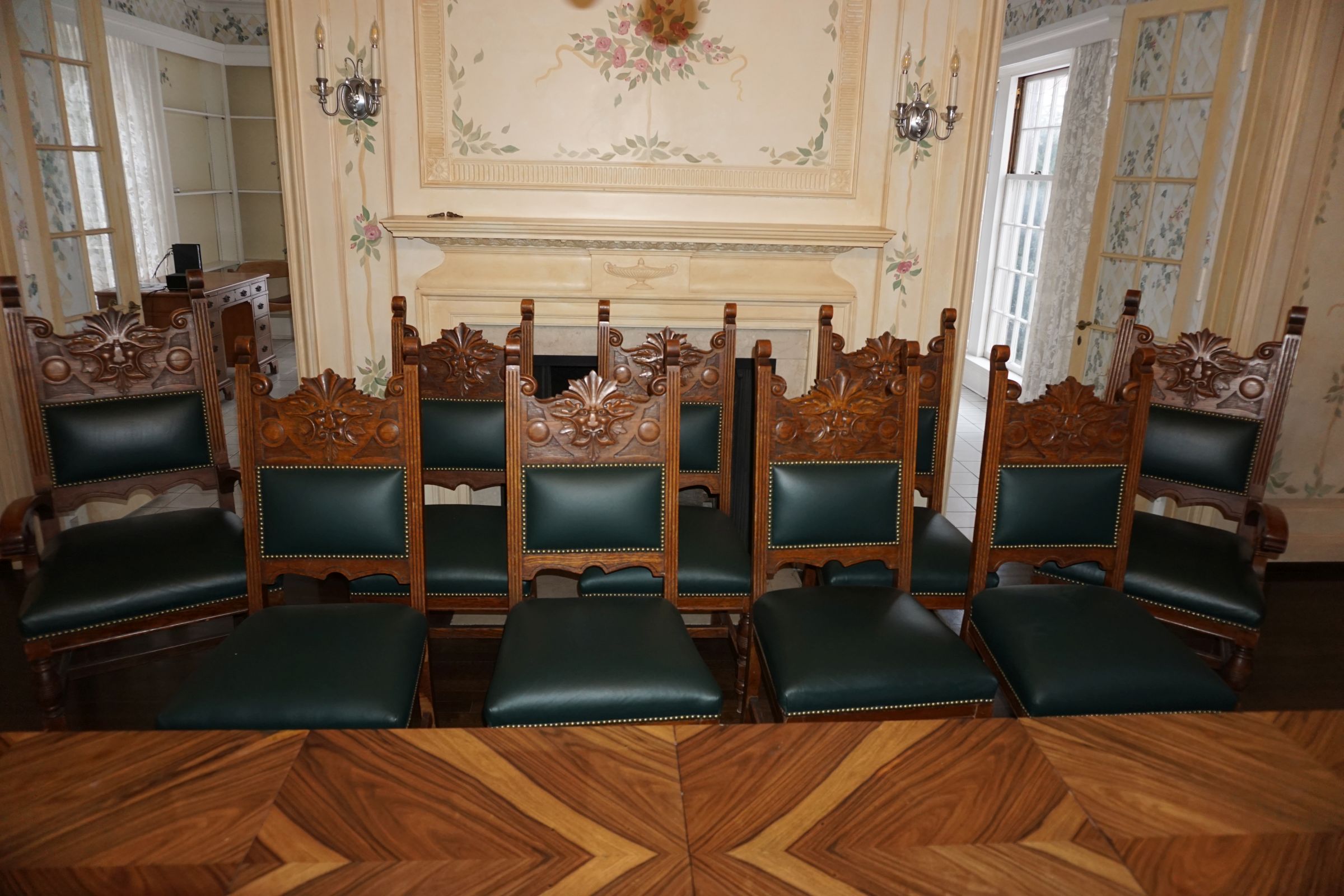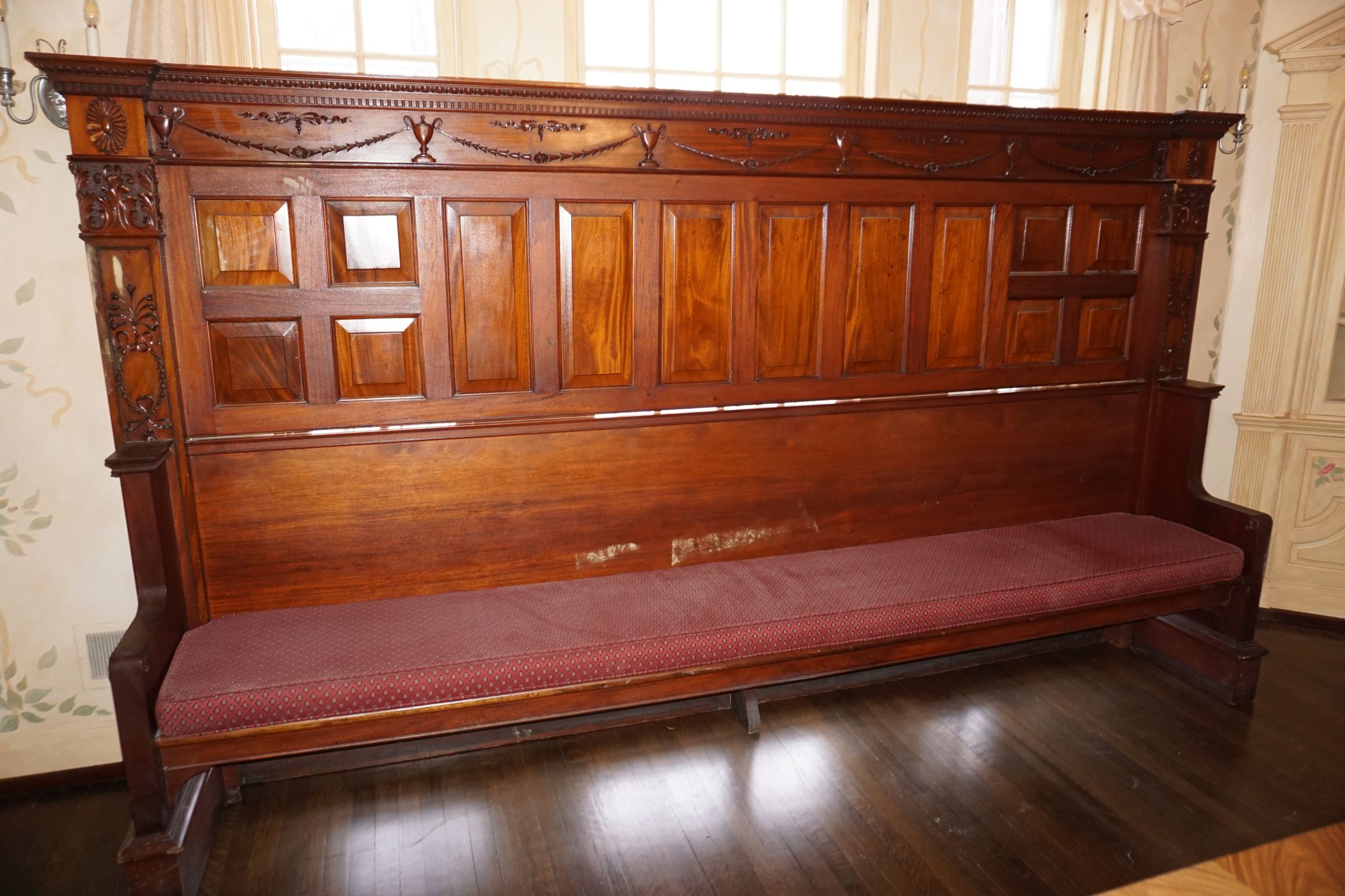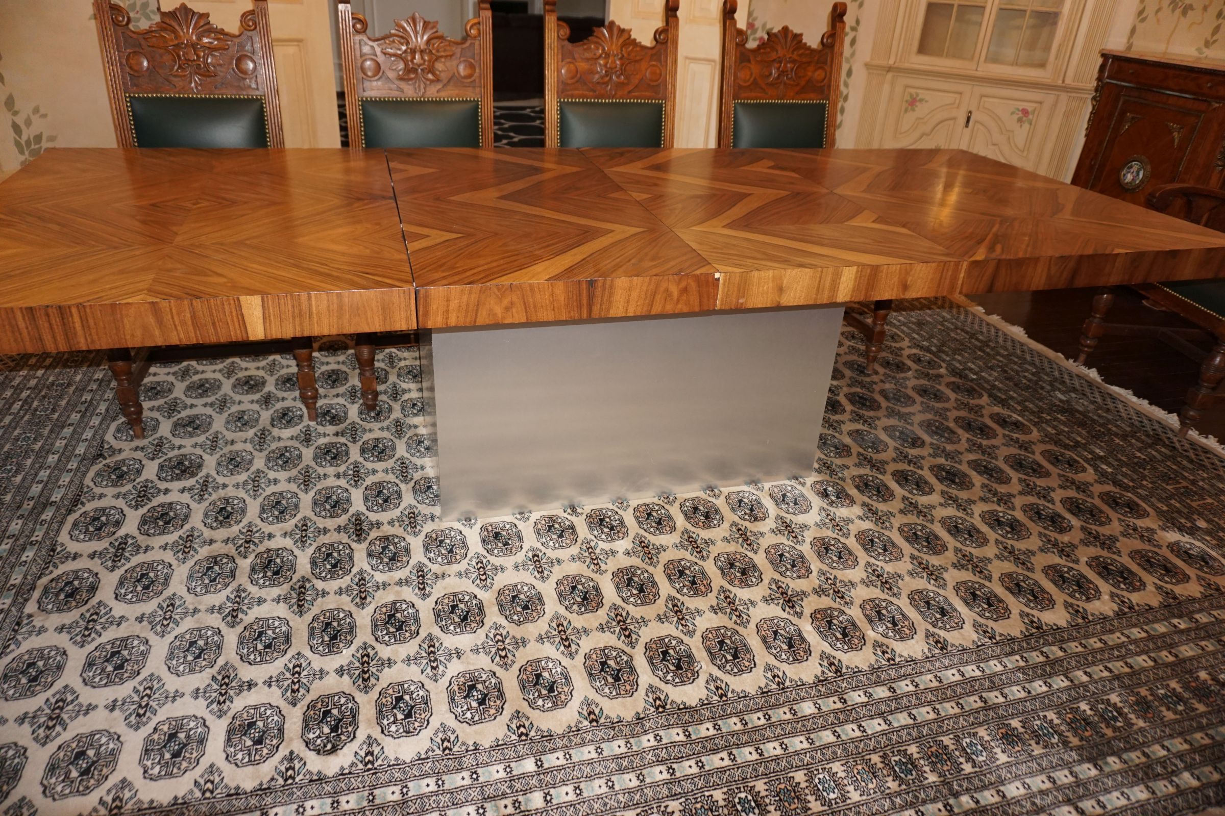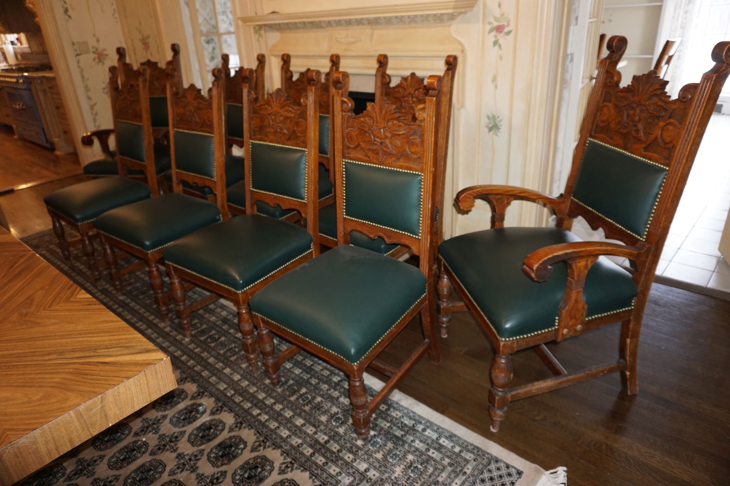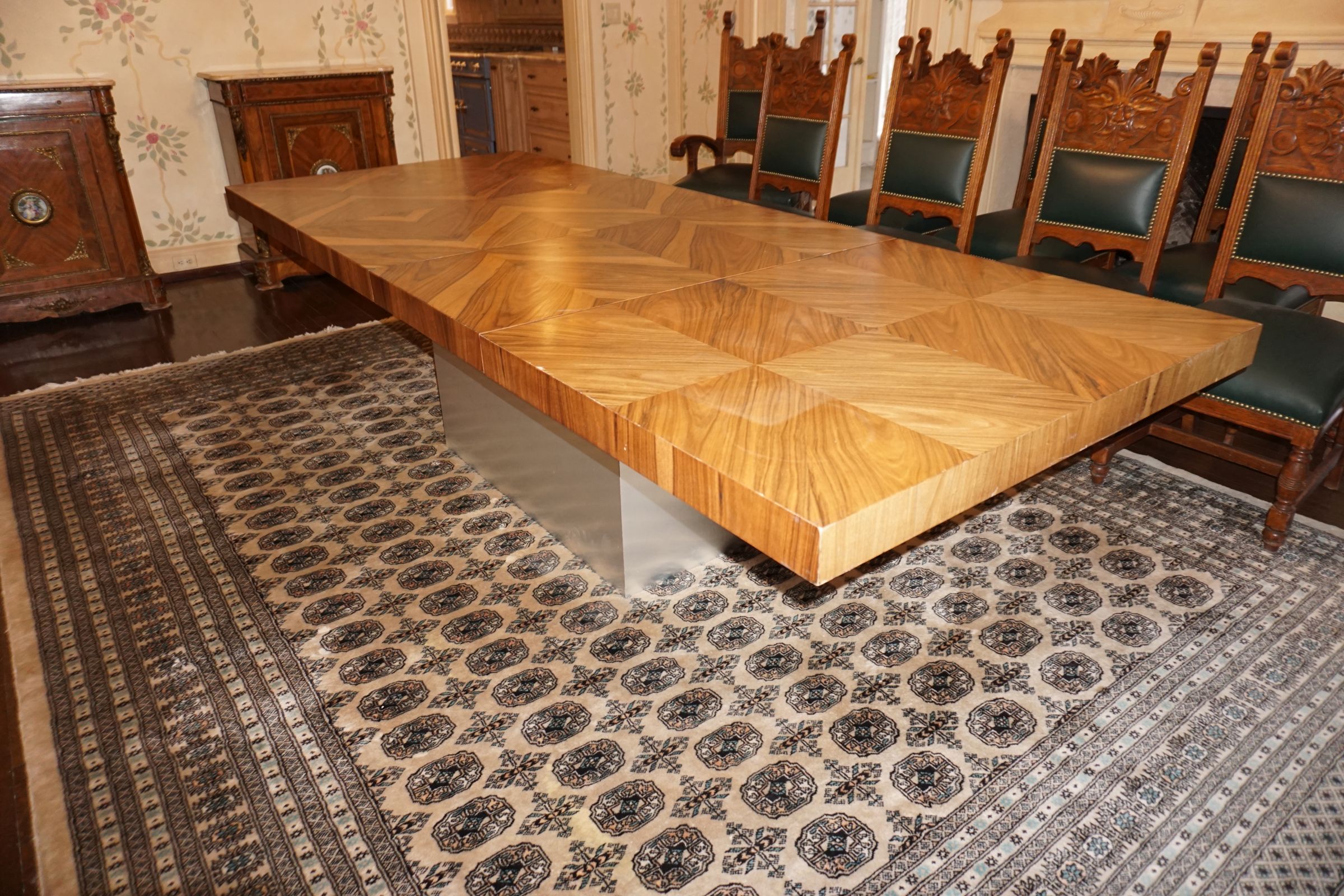 Buffalo Historical High Back Ornately carved Mahogany Settle Bench from The Statler Hilton Hotel, Milo Boughman for Thayer Coggins Walnut Chevron Style with Stainless Steel Base, Set of 9 Antique 19th century carved oak & leather dining room chairs with carved North Wind Face (2 arm chairs & 7 side chairs), pair of Napolean III French Marble Top cabinets with brass ormolu, 10’ x 14’ Bokara Oriental rug, Pine Farmhouse Trestle dining table, set of 8 leather seated chairs, carved Chinese oriental rug, kneehole desk, pair of brass & chrome 2 door cabinets, pair of Asian wall hangings, area rugs, Fox Hunt Oil on Canvas painting by Domingo, Baker Furniture Empire banded mahogany drum table, Louis Phillipe style walnut & leather fainting couch, Mitchel Gold & Bob Williams leather & metal large ottoman, pair of matching tweed style contemporary sofas, Baker Furniture Round pedestal console table, tapestry wall hanging, Large oil on canvas fruit still life in ornate frame, oil on canvas painting of village street scene, Samsung x large TV, Restoration Hardware Mercantile Collection chest/cabinet, pair of reclaimed wood side tables, Baker Furniture bi level coffee table, leather sofa, pair of ornate French provincial lamps, leather recliner, Barbara Barry Collection for Baker Furniture dining table with two leaves & 4 chairs, Set of 4 Butler Everson wood & metal bar stools, Antique French Walnut Armoire, Pair of Vintage Cast Aluminum Barcelona Chairs ( Miles Van Der Rohe), Brutalist chairs & tables, King size tufted upholstered bed, cedar chest, dressers, pair of Queen Size Bassett beds & matching night stands, bar stools, leather sectional, kitchenware, quality patio furniture including two sets of table & chairs, wicker sofa & pair of chairs, metal sofas & table, chaise lounges & more!!