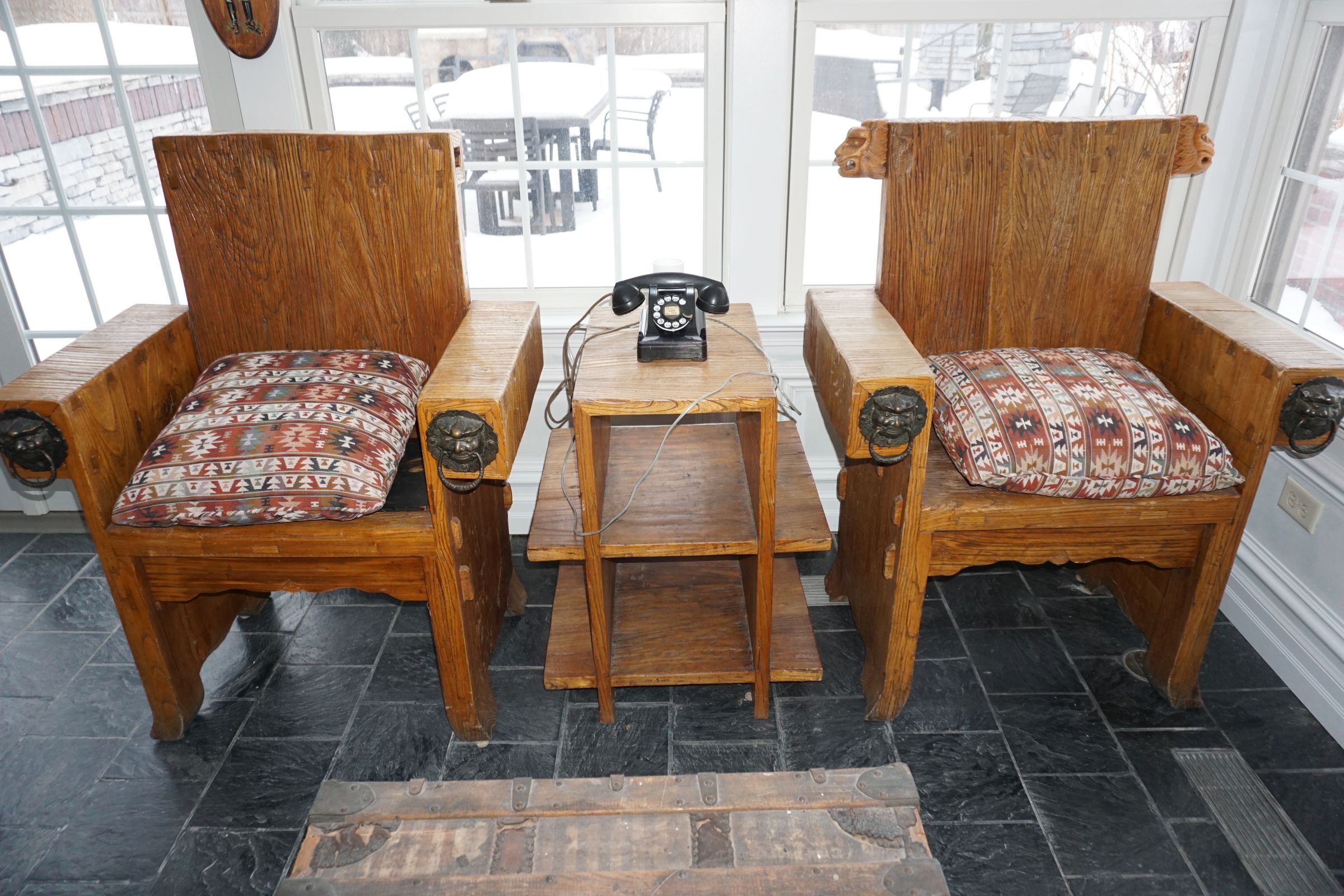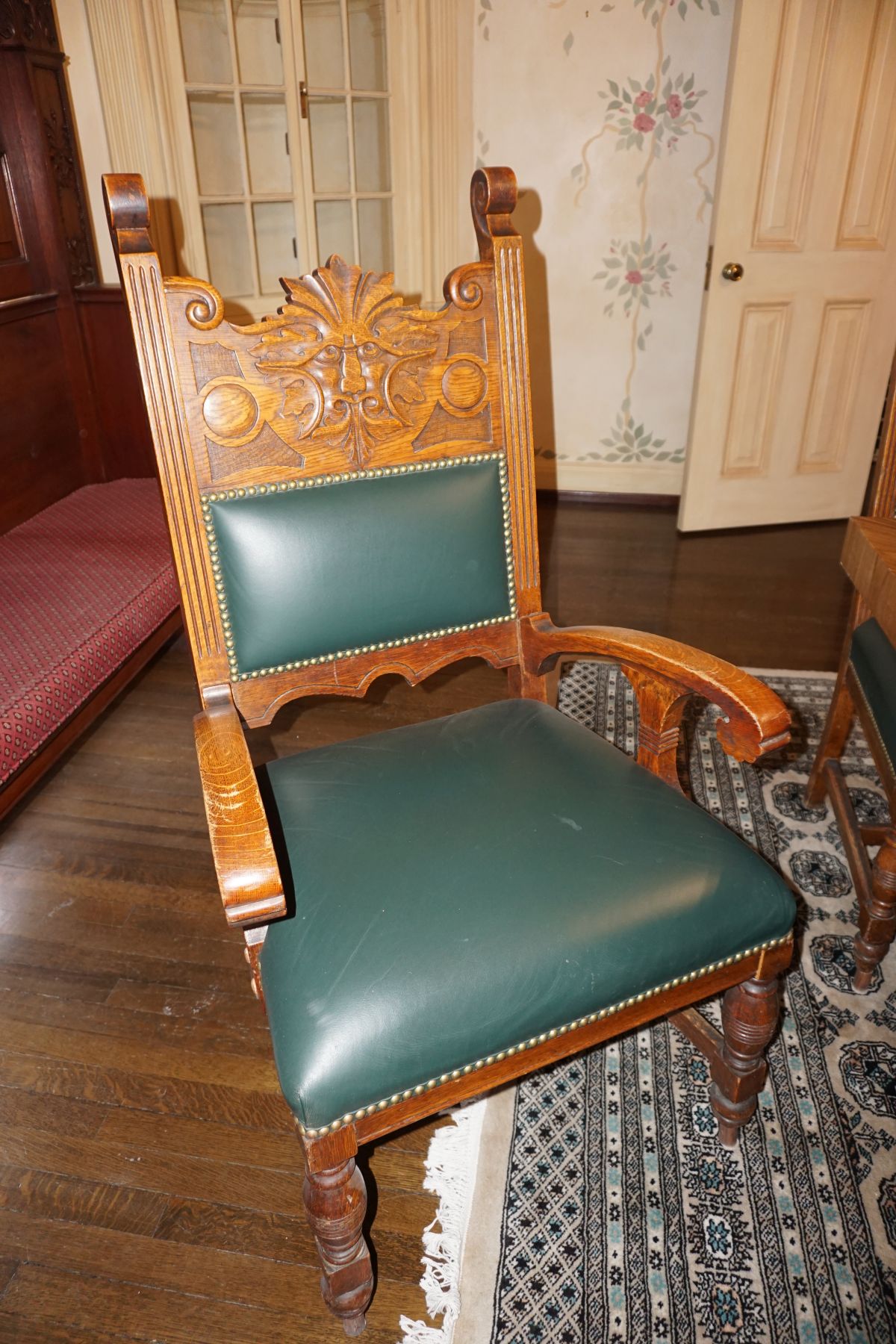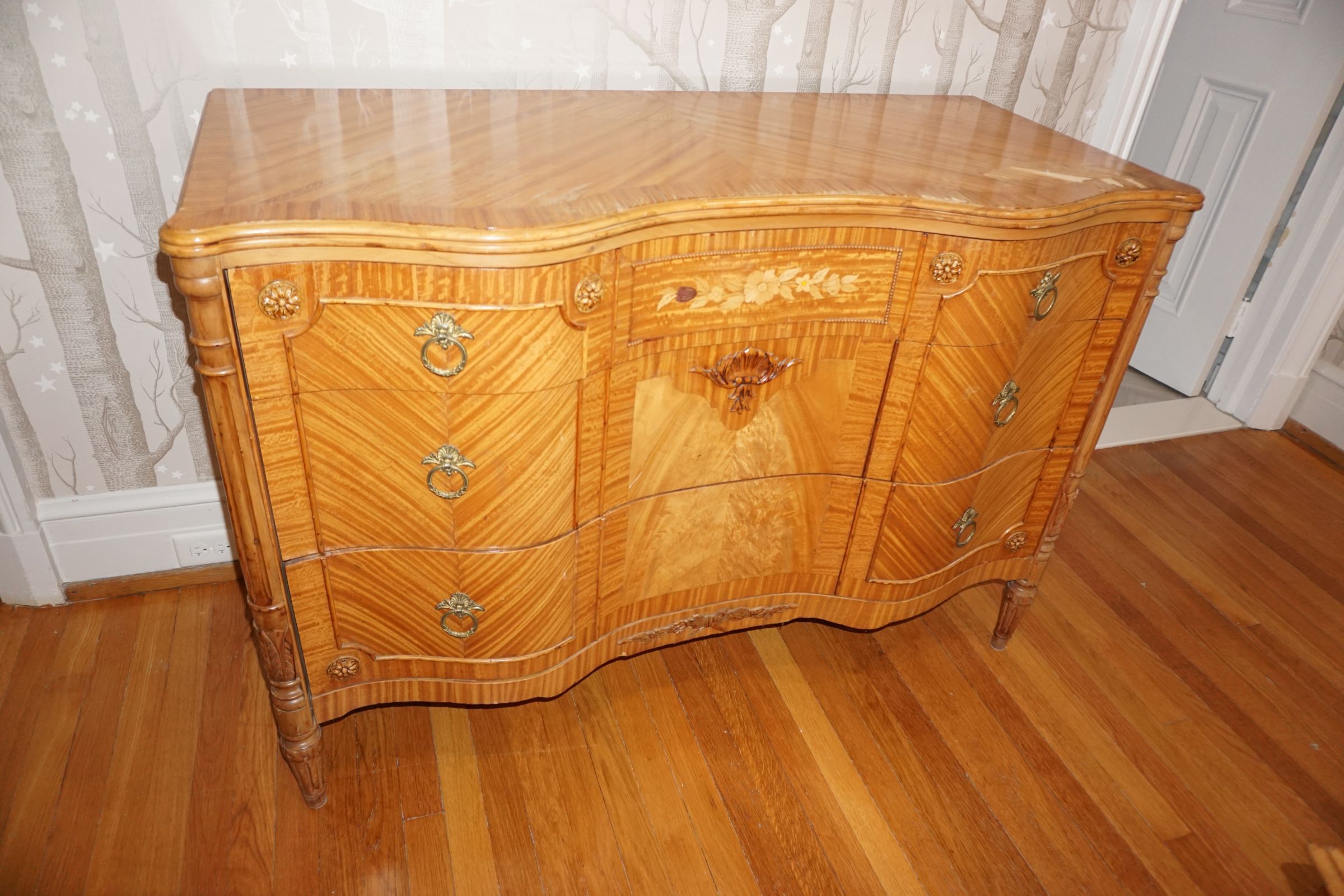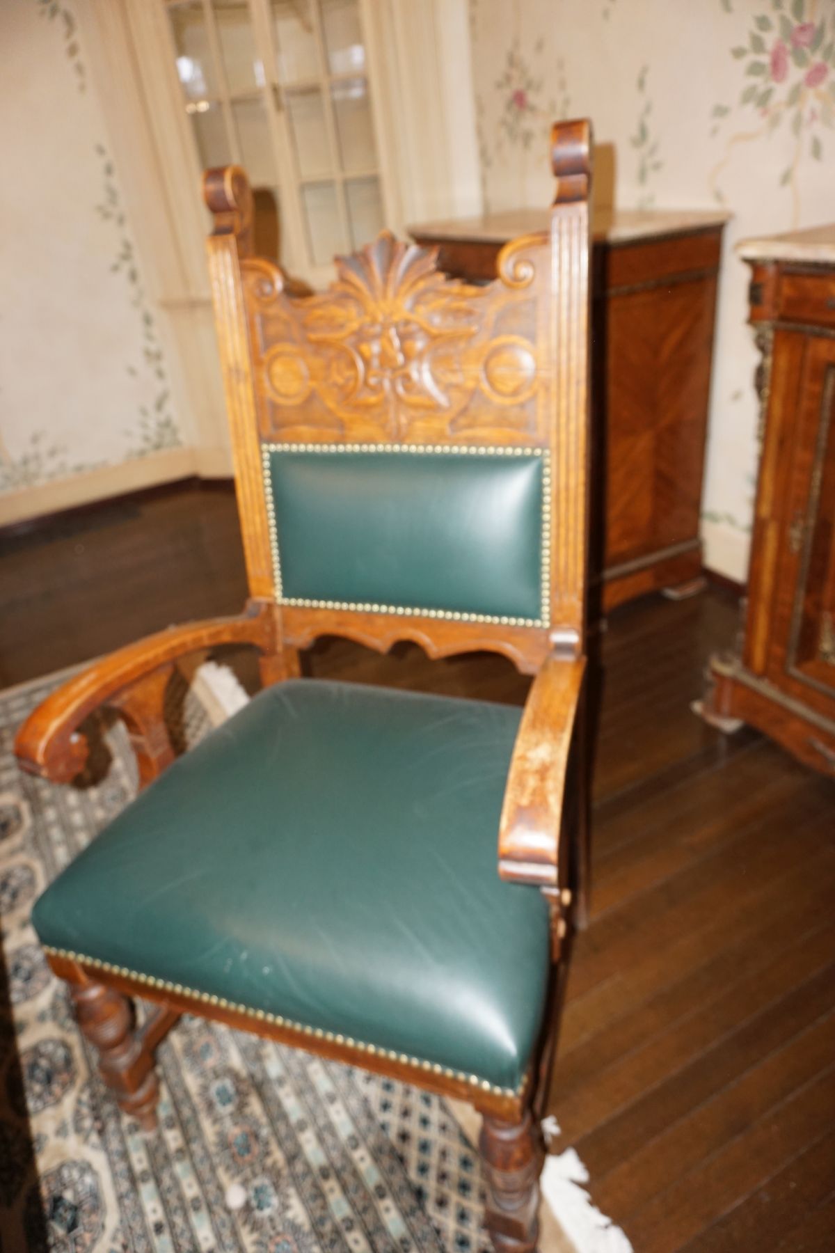 Buffalo Historical High Back Ornately carved Mahogany Settle Bench from The Statler Hilton Hotel, Milo Boughman for Thayer Coggins Walnut Chevron Style with Stainless Steel Base, Set of 9 Antique 19th century carved oak & leather dining room chairs with carved North Wind Face (2 arm chairs & 7 side chairs), pair of Napolean III French Marble Top cabinets with brass ormolu, 10’ x 14’ Bokara Oriental rug, Pine Farmhouse Trestle dining table, set of 8 leather seated chairs, carved Chinese oriental rug, kneehole desk, pair of brass & chrome 2 door cabinets, pair of Asian wall hangings, area rugs, Fox Hunt Oil on Canvas painting by Domingo, Baker Furniture Empire banded mahogany drum table, Louis Phillipe style walnut & leather fainting couch, Mitchel Gold & Bob Williams leather & metal large ottoman, pair of matching tweed style contemporary sofas, Baker Furniture Round pedestal console table, tapestry wall hanging, Large oil on canvas fruit still life in ornate frame, oil on canvas painting of village street scene, Samsung x large TV, Restoration Hardware Mercantile Collection chest/cabinet, pair of reclaimed wood side tables, Baker Furniture bi level coffee table, leather sofa, pair of ornate French provincial lamps, leather recliner, Barbara Barry Collection for Baker Furniture dining table with two leaves & 4 chairs, Set of 4 Butler Everson wood & metal bar stools, Antique French Walnut Armoire, Pair of Vintage Cast Aluminum Barcelona Chairs ( Miles Van Der Rohe), Brutalist chairs & tables, King size tufted upholstered bed, cedar chest, dressers, pair of Queen Size Bassett beds & matching night stands, bar stools, leather sectional, kitchenware, quality patio furniture including two sets of table & chairs, wicker sofa & pair of chairs, metal sofas & table, chaise lounges & more!!